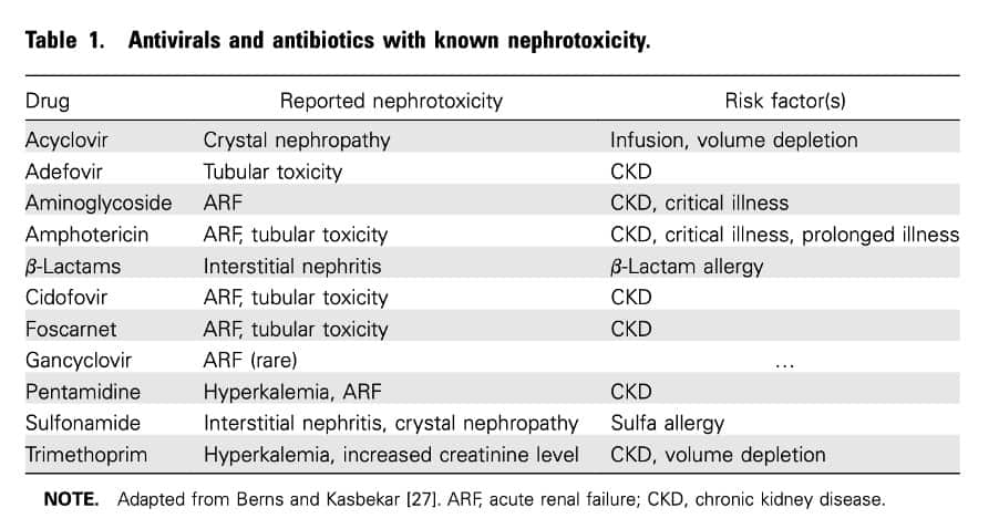 Antibiotics are the most common drugs implicated in reports of drug-induced nephrotoxicity. Certain classes of antibiotics are better known for their nephrotoxic potential, and they include: