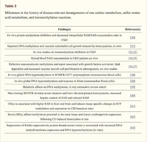 The table above shows all the ways in which changes to a healthy functioning methylation cycle can alter healthy kidney function and tissue repair. For example, we know that higher levels of homocysteine, a by-product of the methylation process of converting folic acid to its active form of 5 methyltetrahydrofolic acid increase the risk of cardiovascular disease, a disease often associated with a decline in kidney function.