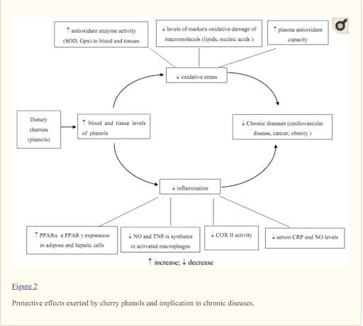 Elevated levels of serum CRP is one of the most important indicators of inflammation and it is a significant risk factor for cardiovascular disease. The decrease in plasma CRP levels after cherry intake suggests a reduction in inflammation that may affect the risk for cardiovascular diseases. Also, the increased production of NO and their reaction product peroxynitrite (ONOO-) contribute to oxidative stress, and tissue injury and an increase in their plasma concentrations is implicated in a variety of rheumatic diseases, including systemic lupus erythematosus, rheumatoid arthritis and osteoarthritis. It has been suggested that the decrease in plasma NO level probably results from inhibition of the enzyme nitric oxide synthase–inducible (iNOS) activity. Studies have demonstrated that anthocyanins are able to inhibit nitric oxide (NO) production and other pro-inflammatory factors such as tumour necrosis factor-alpha (TNF-α), which along with CRP is another major inflammatory cytokine.