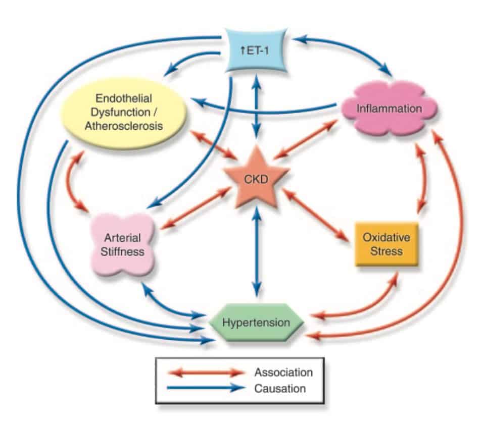 Don’t forget that the kidneys are made up of blood vessels- arteries, veins, and capillaries- so when there is dysfunction in the endothelium the kidneys are one of the organs that are affected. In people with CKD, endothelial damage is thought to be a central process towards progressive kidney damage.